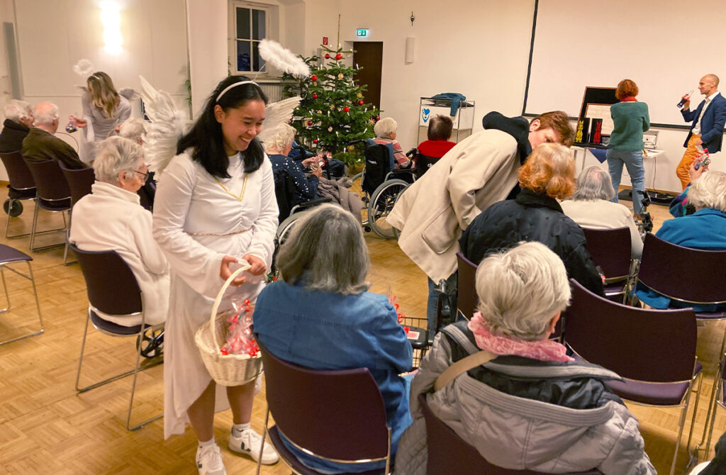 In der Weihnachtszeit besuchten festlich gekleidete „Engel“ ein Altersheim in Darmstadt und überraschten die Bewohnerinnen und Bewohner mit Schokonikoläusen. Die kleine Geste zauberte ihnen ein herzliches Lächeln ins Gesicht. Am Nachmittag folgte eine kleine Zaubershow: Ein abwechslungsreiches Programm voller überraschender Tricks sorgte für große Begeisterung.